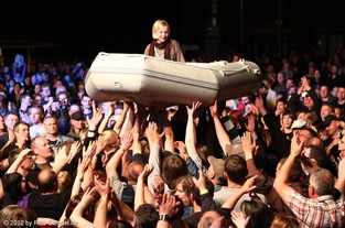 Und wenn man dann mal so an diese riesige Bühne denkt, auf der wir in Wittenberge an der Alten Ölmühle gespielt haben, an die 16 Meter breite Deutschland-Fahne, die gefühlte 67 Meter breite Kulisse, die Leute überraschend schmächtig wirken lässt, das Licht, mit dem sogar die Häuser hinter der Bühne in wechselnden Farben illum... ilu... angestrahlt werden konnten, die fetten Explosionen, die kurz vor Fensterscheibenkiller waren, an das ganze Feuer und den fetten Sound und diese Gigantomanie, dann bleibt einem gar nichts anderes übrig, als sich ganz ganz tief vor all den Spezialisten zu verneigen, die wissen, wie so etwas geht. Danke an unsere heiß geliebten Handlanger Stefan „IschwillschmutzigLiebemitdirmachen“ Ehrhardt, Basti Kabuki-Raettig, Julian Mache-Alles-Donalies, Säule Murat Christoph von Säulensen-Fintel, Andreas Meersdonk-Buhr, Nadine Kapellmeister und last not least an den besten holländischen Import seit der geschmacklosen Wassertomate, Ruud van Loosbroek-Ohnehosen! Ihr seid die Größten! Danke auch an die Local Crew und alle, die sonst noch beteiligt waren und deren Namen wir vergessen haben oder vielleicht gar nicht kannten.